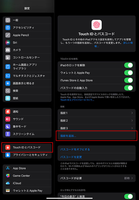 「Touch IDとパスコード」または「Face IDとパスコード」を選択